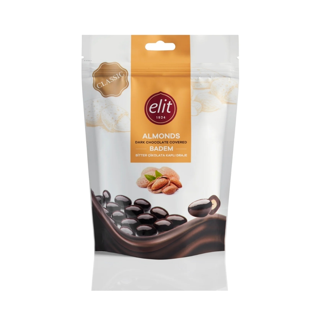 Elit Bitter Çikolatalı Bademli Draje 125 Gr, fermuarlı paketi ve bitter çikolata kaplı badem içeriğiyle lezzetli bir atıştırmalık sunar.