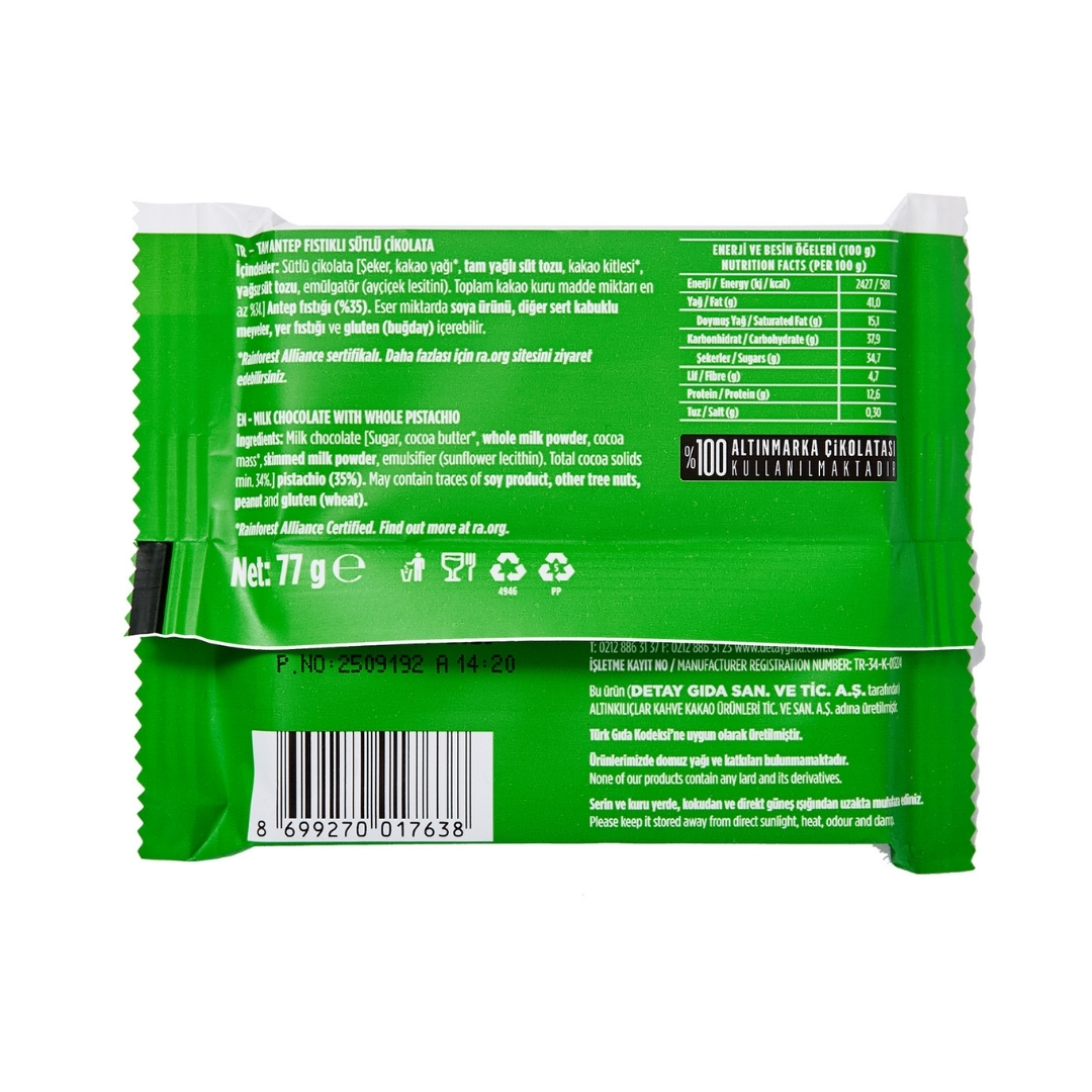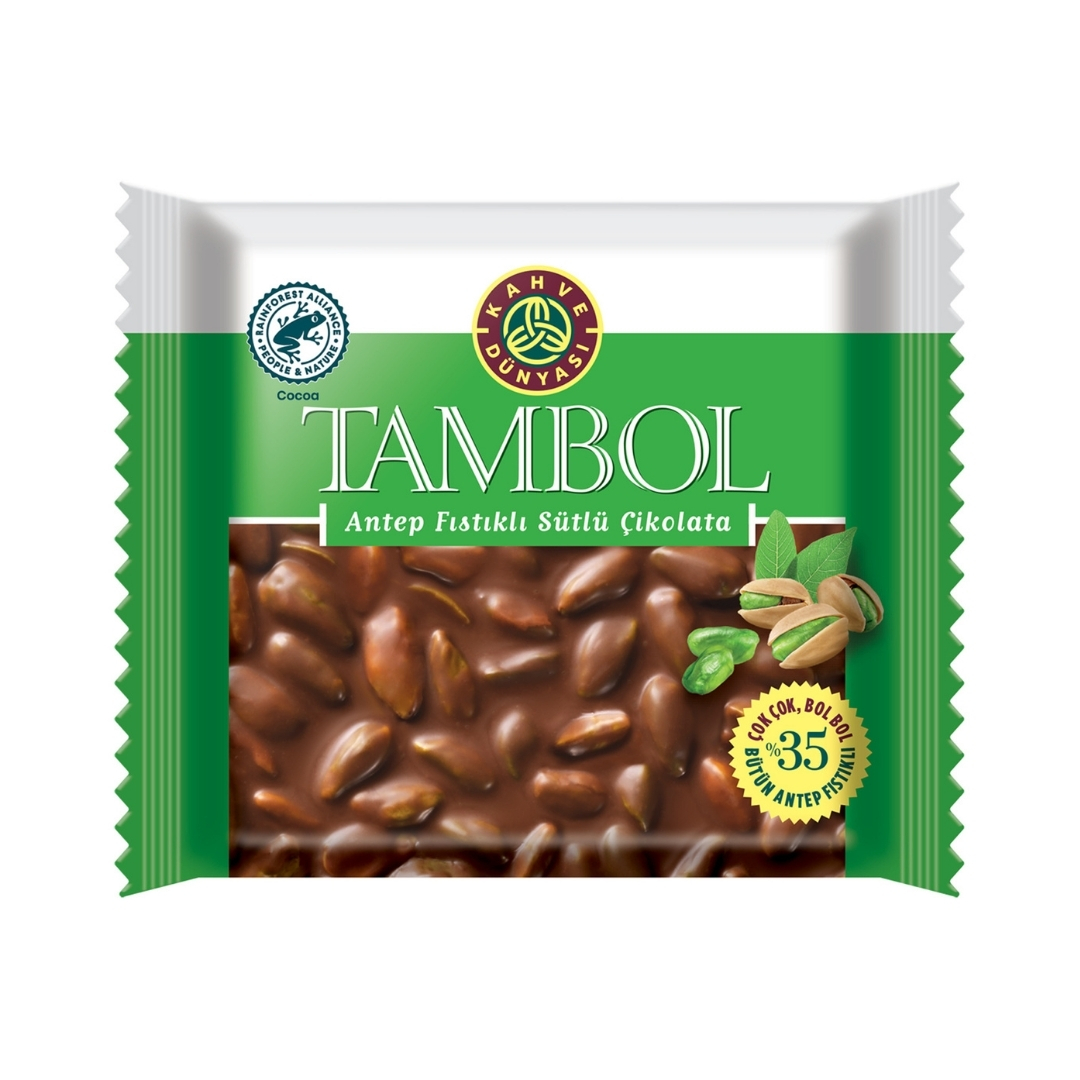 Kahve Dünyası Tambol Antep Fıstıklı Çikolata 77 gr Bolca yemiş lezzetli çikolatayla birleşsin, çikolata keyfi bol bol yaşansın istiyorsan Tambol tam sana göre! TAM ANTEP FISTIKLI SÜTLÜ TABLET ÇİKOLATA 25% Bütün Fıstıklı Sütlü Çikolata Ürün İçerik Bilgisi Sütlü çikolata [Şeker, kakao yağı, tam yağlı süt tozu, kakao kitlesi, yağsız süt tozu, emülgatör (ayçiçek lesitini), aroma verici (vanillin)], Antep fıstığı (%). Alerjen Bilgisi Süt bileşeni ve Antep fıstığı içerir. Eser miktarda soya ürünü, fındık, badem ve gluten(buğday) içerebilir. Besin Değerleri 100 gr için;Enerji (kJ)/(kcal) : 2398 / 574Yağ (g) : 39,0Doymuş Yağ(g) : 16,5Karbonhidrat(g) : 41,9Toplam Şeker(g) : 38,9Lif(g) : 3,9Protein(g) : 11,7Tuz(g) : 0,3
